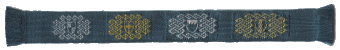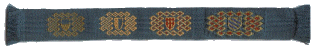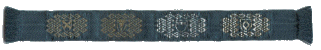 ![]() January 2003 A section of brocaded trim with a repeating knotwork pattern which I made for a friend's wedding dress. I used blue 60/2 silk for the warp; the band is about 17mm wide. |