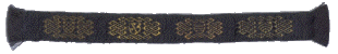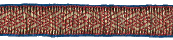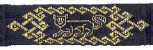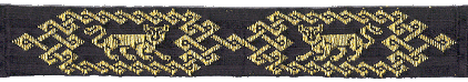![]() May 2003 Brocaded knotwork based on Viking style patterns. The ground weave is 60/2 silk; the brocade is a double weft of gilded silver wire with a diameter of 0.13mm. |