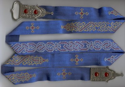 ![]() 2005 30/2 silk brocaded with metallic silver and gold #5 passing thread and red 30/2 silk. Not a great picture, I'm afraid, I'll update it when I have time and show more details of the patterns. The ground weave has lengthwise twist-patterned stripes, though this isn't really visible in the image. I cast the buckle and point in pewter and set them with 10mm carnelian cabochons. The piece was my entry our shire's A&S competition this year; you can find my documentation here if you're interested. |