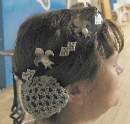 ![]() May 2004 The start and end of a belt brocaded with alternating silver and gold castles, on a 30/2 silk warp of dark blue and purple stripes. The metallic thread comes from Van Sciver Bobbin Lace. I cut the end plates from brass and decorated the point with some very plain engraving to match the masoned look of the castles. Long live newly acquired rotary tools with flexible shafts! |