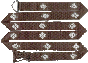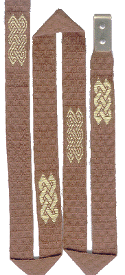 ![]() January 2003 This is half of a belt in brown 20/2 silk with a twist-patterned background and areas of brocade; I got the idea from King Philip of Swabia's belt. |